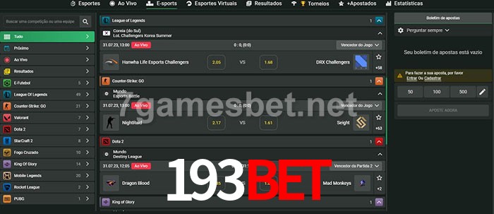 O 193Bet oferece uma grande seleção de opções de apostas em e-sports com probabilidades competitivas